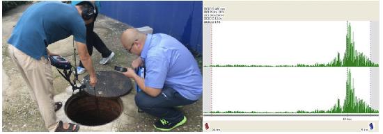 通过噪声记录仪回传的数据显示,初步判定有4条管道范围存在漏失点。为准确确认漏点具体位置,项目人员利用听漏仪和相关仪对这4条管道范围开展漏失点相关定位工作。在现场排查过程中发现,在疑似漏失点管道范围内有*排水井中有较为清晰的流水声音,但打开井盖后,通过水质检测并未发现自来水痕迹,通过相关仪的相关结果显示漏点恰好位于排水井附近。水司对该漏失点进行开挖和修复工作,发现噪声数据与现场判断*致,年节水1万立方米。