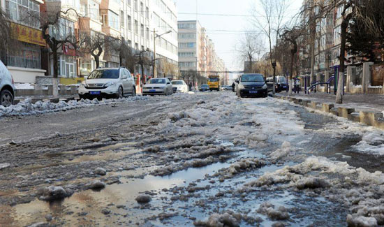 “在岳阳街与至善路交会往东,马路边有一处自来水管漏水,水量非常大,已经快流到树勋街口,路边有多辆车都冻上了。”1月31日清晨长春市南关区环卫工人突然发现管辖的街道已经成了冰天雪地,经查明供水管网的漏损点在岳阳街与至善路交会处东50米处,此处漏水管道为直径150毫米的次供水管道。抢修人员在漏水现场用挖掘机械挖出一个长约2米、宽约1米、深约2米的深坑,查明供水管道的漏水点。随后,供水抢修人员将“哈夫节”(一种管路抢修装置,由两个半圆组成,套在一起能组成一个箍)用螺丝拧紧后,整个管道抢修工作在两个小时内结束,随即开始回填沙石平整路面。与此同时,负责相关地段的南关环卫工人开始清理积冰,据负责人表示整条路段清理干净至少需要两到三天,他们会尽快恢复路面畅通。